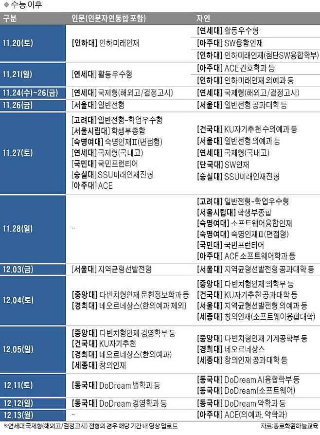 11월 26일(금)엔 연세대(미래)와 한국기술교대 논술이 진행된다. 27일(토)~28일(일) 주말 동안엔 한양대, 중앙대, 이화여대, 한국외대, 세종대, 고려대(세종) 등이 논술을 치른다. 아주대, 인하대가 12월 4일(토)~5일(일) 논술 실시로 일정이 가장 늦다.