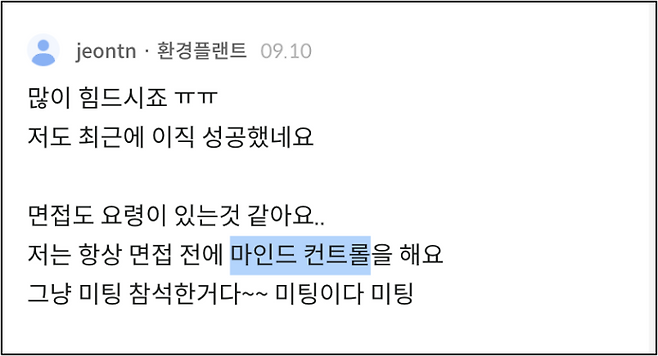 “회사 다니면서 했던 수 많은 미팅 중에 하나다”라고 생각해 보라는 조언입니다. 미팅은 나와 상대방이 어느 정도 대등하잖아요. 부담없이 자신의 목표와 하고픈 바를 얘기하는 거죠. 미팅은 잘 안될 수도 있는 거고요.
