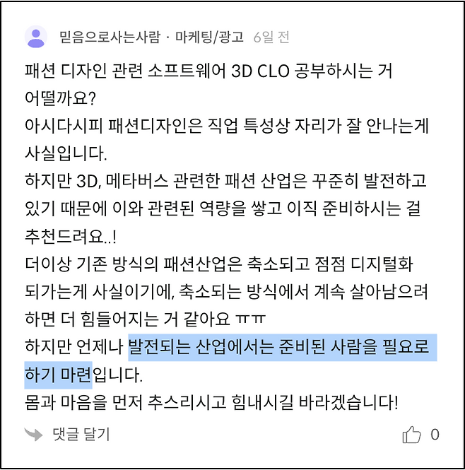 "디자인중에서도 패션쪽이 특히 박한걸로 알고있는데 글쓴님, 좌절이 계속되진 않을겁니다. 언젠가는 끝날 이 괴로움, 잘 버티시다 보면 내가 마음 고생하던 때가 있었지 하는 날이 찾아올겁니다." (고기짬뽕 · 시각·광고 디자인)
