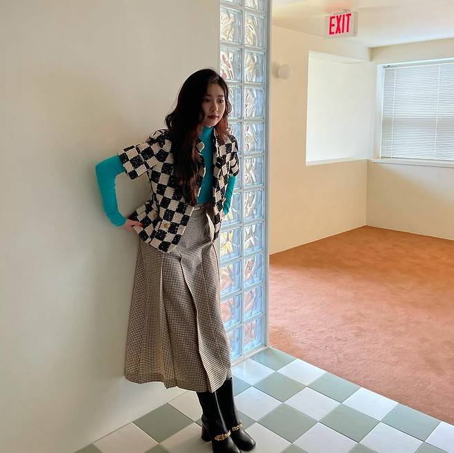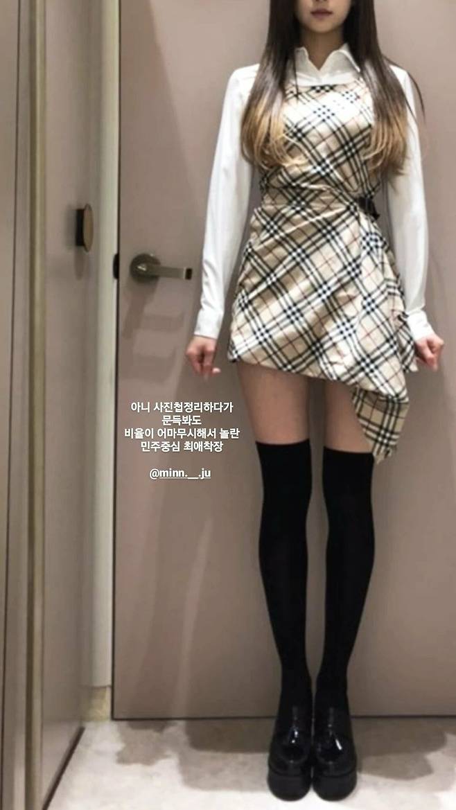사진 속 김민주는 체크 무늬 치마에 검정 타이즈 차림으로 압도적 비율의 긴 다리를 뽐내 눈길을 사로잡았는데요.