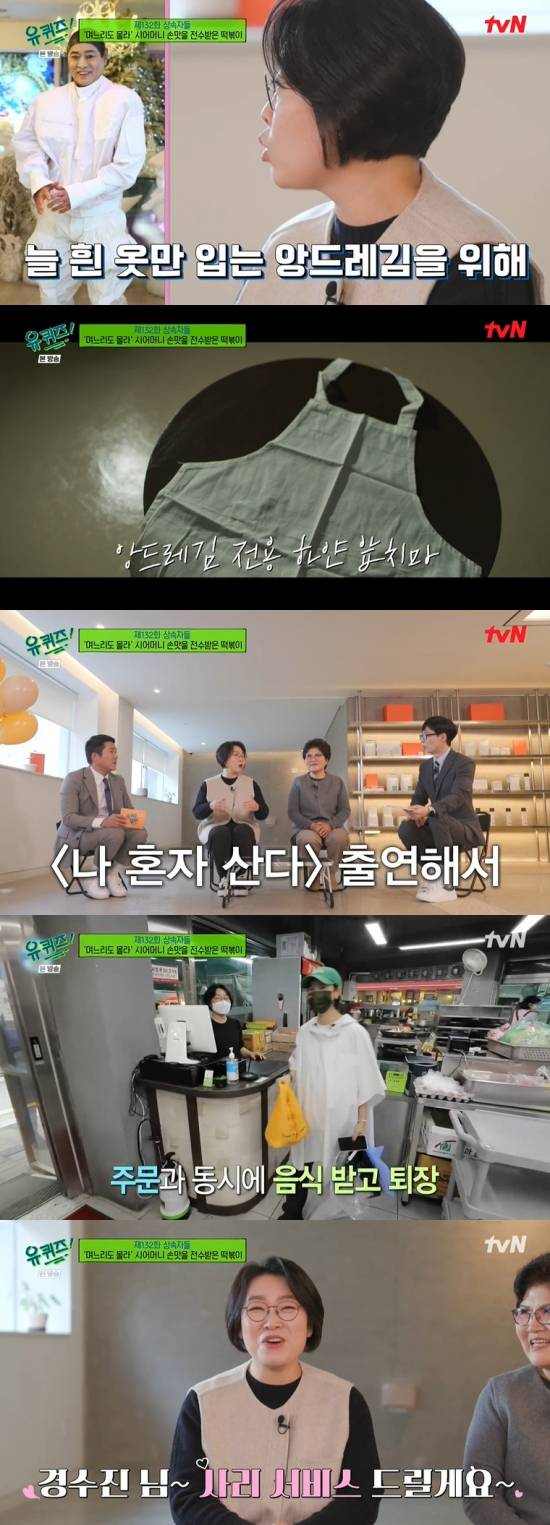 박은순 씨는 "옆 테이블에 학생들이 와서 먹고 있으면 그 집 것까지 다 내주셨다. 꼭 부르신다. 계산해 드리면 남는 거 팁도 주셨다. 하얀 옷을 늘 입고 오시니까 저희 앞치마가 빨간색이다. 하얀색 앞치마도 해놨다"라며 회상했다.