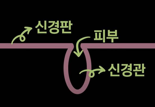 피부와 신경조직은 모두 외배엽*에서 만들어집니다. 외배엽에서 신경판이 먼저 형성되고, 그것이 안쪽으로 둥그렇게 말리는 부분은 신경관이 됩니다. 그리고 바깥쪽에 남아있는 외배엽은 피부가 되는 것인데요. 이때 피부가 신경관 쪽으로 말려 들어가는 경우 딤플이 만들어지게 됩니다.
