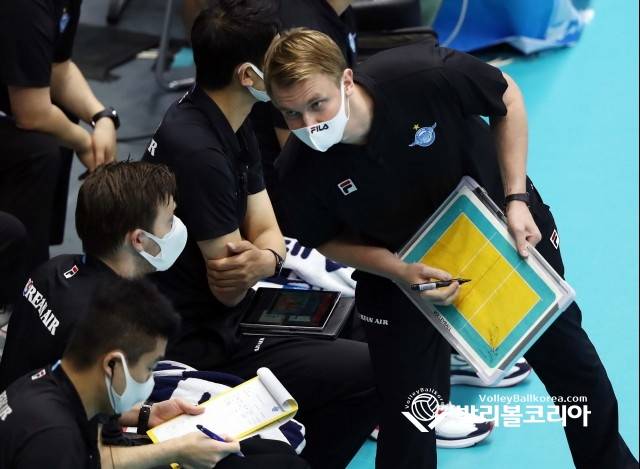 17일(화) 경기도 의정부시 의정부체육관에서 열린 2021 의정부-도드람컵(kovo컵) 프로배구대회 남자부 B조 KB손해보험 vs 대한항공 경기에서 대한항공 토미 틸리카이넨감독이 카스페 부오리넨코치와 이야기를 하고 있다.