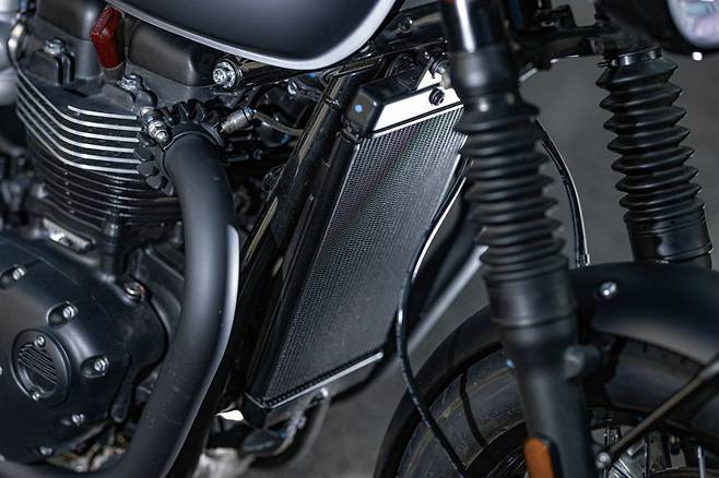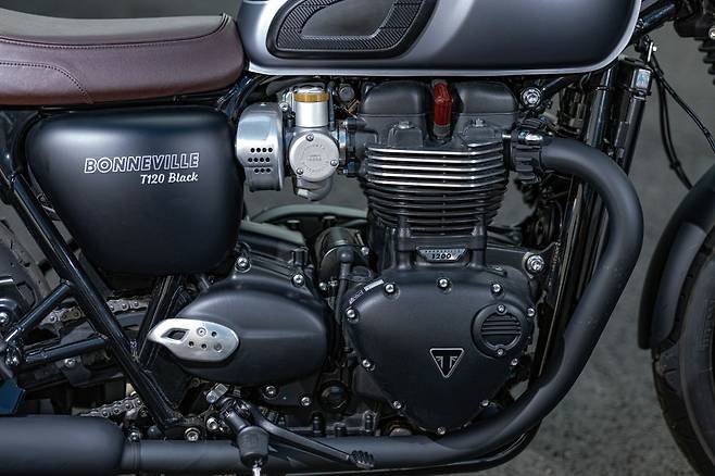 본네빌 시리즈는 요즘이나 60년 전 모델이나 외형은 비슷하다. 보통 과거 모델의 이미지를 그대로 따르는 경우 자칫 올드하게 느껴질 수 있는데 T120은 예전이나 지금이나 여전히 아름답다. 특히 원형 헤드라이트, 철제 연료탱크, 납작한 시트, 가늘고 길게 늘어진 머플러 등으로 전체적인 실루엣이 익숙하면서도 우아한 느낌을 준다. 게다가 수랭 엔진임에도 냉각핀과 카뷰레터( 모양만 살린더미커버)까지 디자인으로 살려 옛 스타일을 고수하고 있다. 수랭 엔진의 적용으로 인해 생긴 라디에이터는 차대 사이에 납작하게 숨기고 냉각수 보조 탱크는 엔진 뒤쪽에 숨겼다. 머플러도 언뜻 보기에는 엔진 헤드에서부터 배기 머플러까지 각각의 관으로 이루어진 것 같지만 라인 중간에 하나의 순환장치를 마련해 높아진 환경 규제와 소음에 대응한다. 연료 탱크에 붙은 로고 배지는 깔끔한 디자인으로 변경되었다. 시대가 발전함에 따른 변화를 적용하면서도 전통적인 실루엣은 그대로 유지하고 있다. 시승 차량의 경우 T120 블랙 에디션이기 때문에 엔진 커버, 사이드 커버, 매니폴드 등에 크롬 대신 매트 블랙으로 칠해져 더욱 시크한 느낌이다.
