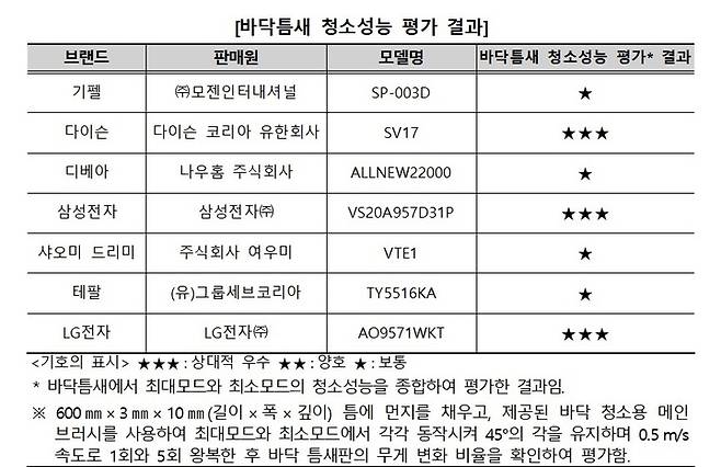 바닥 틈새의 먼지에 대한 청소 성능을 다이슨, 삼성전자, LG전자 등 3개 제품이 상대적으로 우수했다. 기펠, 디베아, 샤오미 드리미, 테팔 등 4개 제품은 상대적으로 틈새 먼지를 잘 제거하지 못해 '보통' 수준으로 평가됐다.
