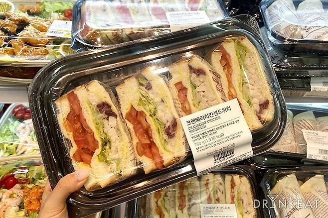 바쁜 아침 든든한 한끼로 샌드위치 만한 것이 없기 때문에 일요일 저녁에 장을 볼 때는 다음날 아침에 먹을 샌드위치를 꼭 담아두는 편입니다. 트레이더스에서는 달콤한 크랜베리와 양념이 듬뿍 배어 있는 샌드위치를 추천할게요. 치킨과 양상추, 토마토가 곁들어 있는데 그중 싱싱한 토마토가 아주 두툼하게 썰려 있어 식감이 아주 좋아요!