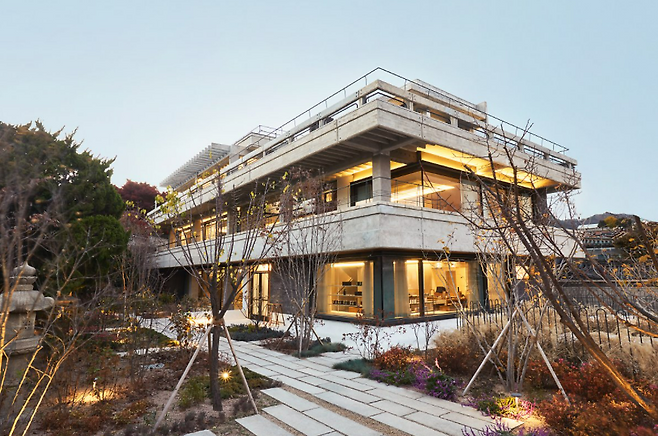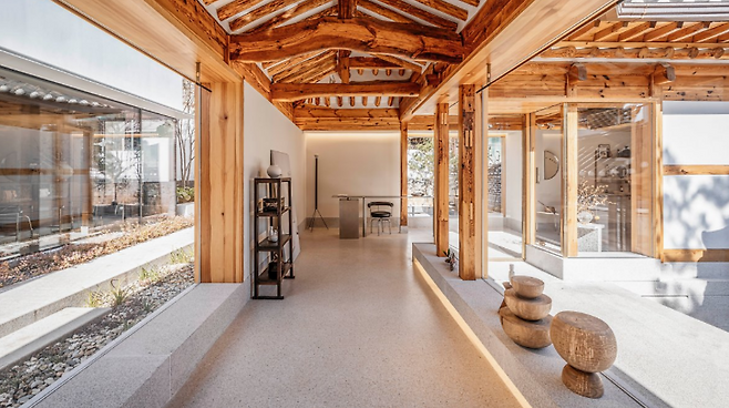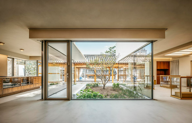 가회동 대로변에 위치한 이곳은 폭이 8m에 이르는 한옥 외부 입면만으로 시야를 압도한다. 어쩌면 고객들은 이 장면만으로도 한국성을 강조하는 설화수의 태도를 짐작할 것이라고 판단했다. 그래서 내부에는 의외성을 지닌 디자인 요소를 적용하고자 했다. ‘설화수’, ‘북촌’, ‘한옥’, ‘플래그십 스토어’라는 단어로부터 예상 가능한 시나리오를 깨고 싶었다. 전체 공간은 한옥에서 양옥 그리고 정원까지 매끄럽게 이어진다. 사람과 건축 그리고 브랜드 간 자연스러운 소통이 이뤄지면서도 부담 없이 쉴 수 있는 공간을 의도한 결과다. 특히 중정은 한옥과 양옥 사이에 있는 약 5m 높이의 축대를 허물어 만든 것이다. 한옥에서 양옥으로 올라가는 여정을 염두에 두고 하향 증축한 공간으로 두 건물을 연결하는 구심점이라고 할 수 있다.