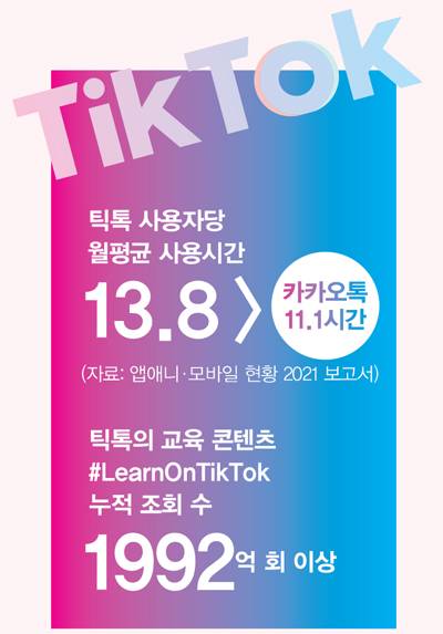그러나 틱톡은 이제 더 이상 '10대들이나 아는 영상들이 올라오는 플랫폼'으로 치부할 수 없다. 틱톡 이용자는 전 세계 10억 명에 이르고, 앱 다운로드는 30억 회 이상이다. 모바일 데이터 분석 플랫폼 앱애니의 '모바일 현황 2021 보고서'에 따르면 틱톡의 사용자당 월평균 사용시간은 13.8시간으로, 카카오톡(11.1시간)을 제치고 1위를 기록했다. 틱톡을 안 써본 사람은 있을지라도, 한번 써본 사람은 틱톡에 푹 빠지게 된다는 얘기다.