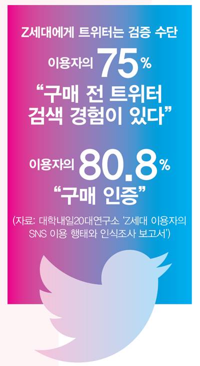 다른 플랫폼에 대해 이용자 반응이 빠르다는 점은 트위터가 마케팅 창구로 주목되는 이유이기도 하다. 특히 트위터의 콘텐츠는 소비로도 직결된다는 특성이 있는데, Z세대는 상품을 구매하기 전에 트위터에서 검색하는 경우가 많다. 인스타그램이나 블로그 등에 비해 광고 오염도가 상대적으로 낮은 공간이라고 인식하기 때문이다. 대학내일20대연구소의 'Z세대 인스타그램, 페이스북, 트위터 주 이용자의 SNS 이용 행태와 인식조사 보고서'에 따르면, 트위터 이용자의 75%가 "구매 전 트위터 검색 경험이 있다"고 답했고, 주로 키워드 검색을 통해 긍정·부정적 후기 등 경험자의 솔직한 리뷰를 탐색한다고 밝혔다. 구매 인증을 하는 경우(80.8%)도 많다.