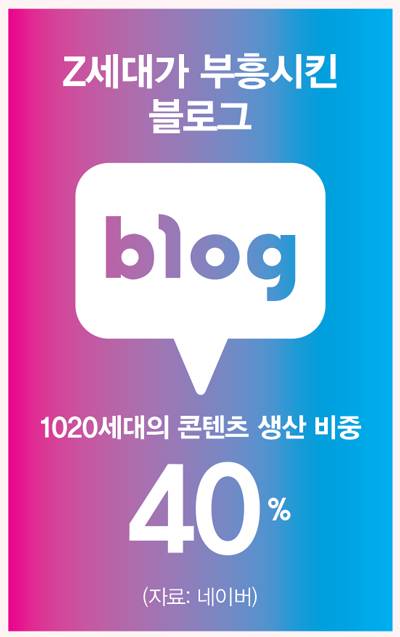 이렇게 Z세대가 노는 플랫폼들 틈에서 이상한 움직임이 하나 감지된다. Z세대가 블로그를 한다. 과거에는 지금의 유튜버처럼, 사람들이 많이 찾는 블로그 운영자는 '파워 블로거'라 불리며 인기를 끌었다. 그러나 텍스트보다 동영상이, 긴 글보다 짧은 워딩이 부흥하면서 블로그의 전성기는 막을 내리기 시작했다. 그렇게 블로그는 전성기가 끝난 플랫폼처럼 여겨졌다. 최근의 트렌드와는 다른, 핫하지 않은 플랫폼에도 Z세대는 발을 들였다. 네이버에 따르면 1020세대의 콘텐츠 생산 비중은 40%를 넘었고, 생산량도 꾸준히 증가하고 있다. 이유는 뭘까.