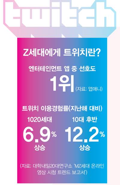 그러나 Z세대는 이 트위치를 띄웠다. 게임을 좋아하는 10대가, 덜 선정적인 콘텐츠를 찾던 Z세대가 트위치를 시청했고, 트위치 스트리머들을 양산했다. 빅데이터 플랫폼 아이지에이웍스 모바일인덱스에 따르면, 2016년 30만 명에 그쳤던 트위치의 월간 활성 사용자 수(MAU)는 5년 새 8배나 증가한 253만 명(6월 기준)에 이른다. 대학내일20대연구소의 'MZ세대 온라인 영상 시청 트렌드 보고서'에서도 트위치의 성장은 엿보인다. 1020세대의 트위치 이용 경험률은 지난해 대비 6.9% 상승했고, 10대 후반의 경우 12.2%나 올랐다. 같은 기간 페이스북, 유튜브, 아프리카TV의 이용 경험률은 하락한 것을 보면, 트위치가 Z세대가 가장 선호하는 '라이브 방송' 플랫폼이라는 것이 입증된다. 실제로 앱 분석 업체인 앱애니가 지난해 하반기 Z세대를 대상으로 조사한 결과, 트위치는 엔터테인먼트 앱 중 선호도 1위를 차지했다.