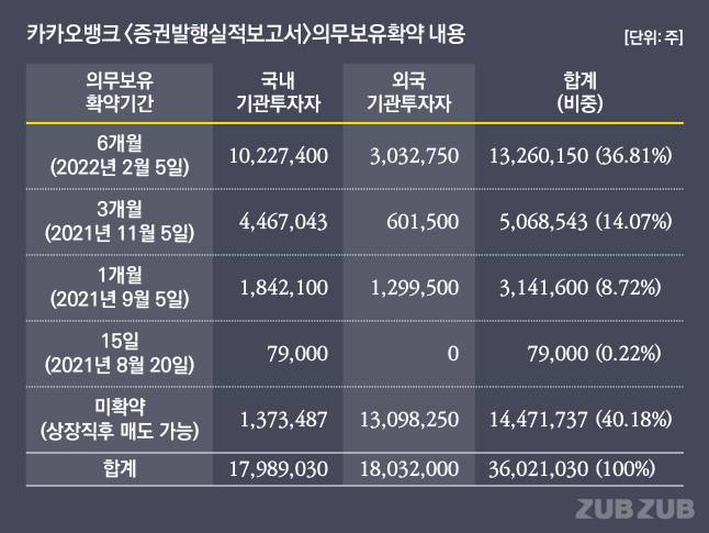 카카오뱅크 수요예측에 참여한 기관들은 공모주를 더 많이 받기 위해 의무보유확약을 제시했고, 최종적으로 기관투자자가 확보한 공모주(3602만1030주)의 59.82%(2154만9293주)가 상장후 최소 15일에서 최대 6개월간 매각하지 않는다는 약속을 하고 받는 물량이에요.