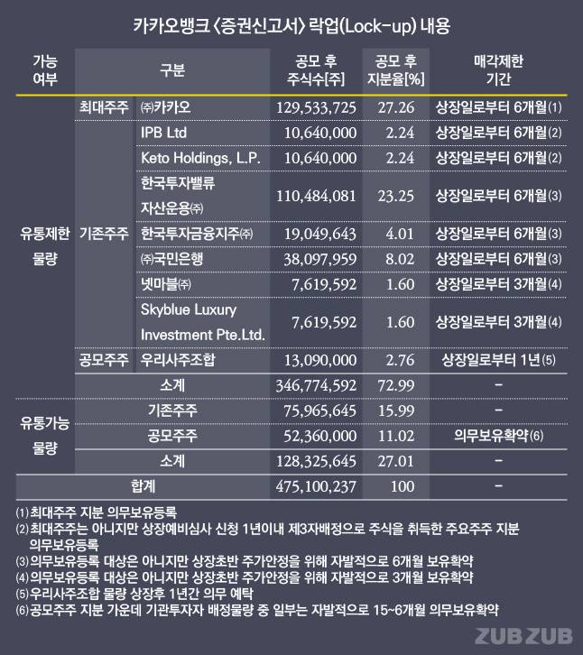 카카오뱅크의 최대주주 카카오, 그리고 최대주주는 아니지만 상장예비심사 신청 1년 이내 제3자배정으로 카카오뱅크 주식을 취득한 주주(IPB Ltd, Keto Holdings)는 상장후 6개월간 법적으로 주식을 팔 수 없어요. 즉, 각주의 1번과 2번은 의무보유등록 대상이죠.