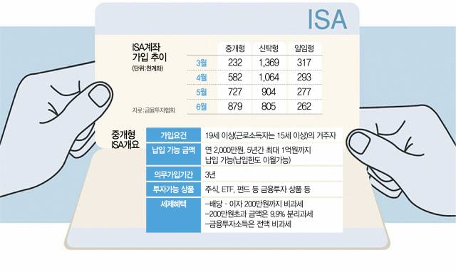 27일 금융투자협회에 따르면 지난 6월 말 기준 중개형 ISA는 87만 9,000개로 전월 대비 15만 개 이상 증가했다. 또 적립금 규모도 1조 원을 넘어섰다. 일반 주식위탁매매계좌와 마찬가지로 주식과 상장지수펀드(ETF)를 매매할 수 있는 중개형 ISA는 올해 2월 말 처음 출시됐다. 이달 말까지 가입자 100만 명을 넘길 것으로 업계에서는 보고 있다.