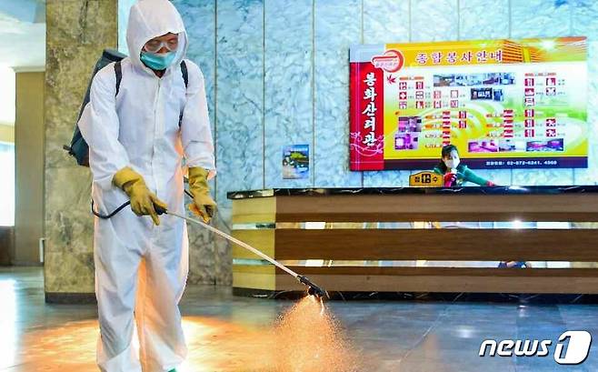 (평양 노동신문=뉴스1) = 북한 노동당 기관지 노동신문은 2일 사소한 빈틈도 없게 코로나19(신종 코로나바이러스 감염증) 비상방역전에 계속 총력을 집중하자고 촉구했다. 사진은 소독 중인 봉화산 여관.