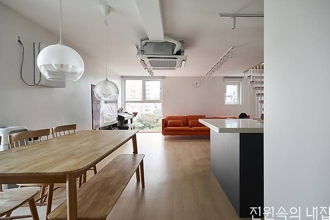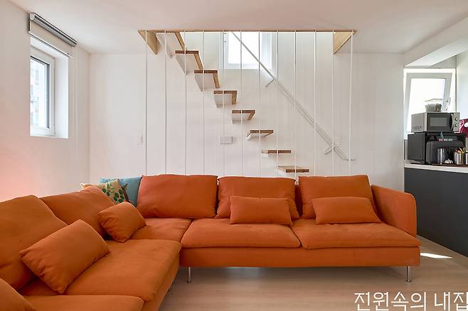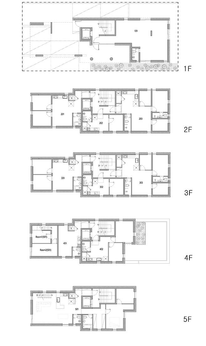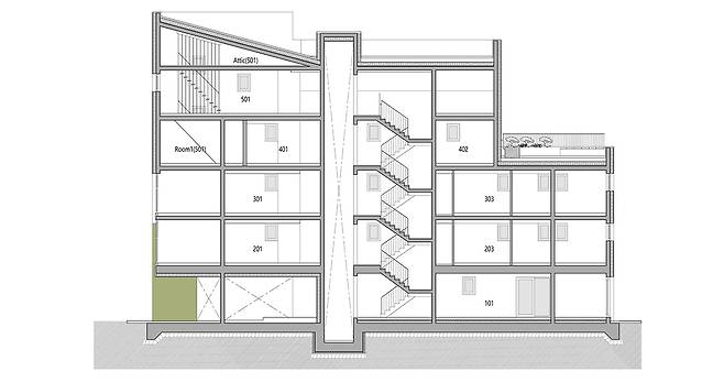 건물의 구성은 다음과 같습니다. 1층 근생 1호. 2층에 원룸, 투룸, 쓰리룸 3세대. 3층은 2층과 동일하고 4층에 원룸과 투룸 2세대. 마지막으로 4층 일부와 5층과 다락의 3개층을 사용하는 주인세대가 있습니다. 임대성의 균형을 위해 도로쪽에 투룸 세대를, 뒷편에 쓰리룸 세대를 주로 배치했습니다. 그 사이에 원룸이 끼어 있고요. 다양한 시장의 요구에 다양한 세대구성으로 대응하는 전략인데 사용승인과 함께 임대가 거의 완판됐으니 전략 성공이라 할 만 합니다. 5층은 주인세대 거실과 안방 영역이 자리하고 4층과 다락으로 나뉜 세 아이의 방은 거실에서 실내계단으로 연결됩니다.