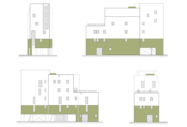 첫 검토 때는 항상 하던 대로 최대치의 면적을 찾았습니다. 땅 크기가 약 340㎡니 용적률 200%로 건물 크기는 680㎡. 예산 초과가 예상됐습니다. 시행사가 아닌 개인이 짓기에는 땅이 조금 큰 편이었습니다. 9세대의 원투쓰리룸 구성을 그대로 유지하면서 예산에 맞게 건물 규모를 조정하는 작업이 이어졌습니다. 처음에는 이게 가능한 일인지 걱정도 됐으나 어찌어찌 예산에 맞는 560㎡ 건물이 나왔습니다. 종심형으로 좁고 긴 대지의 깊이 방향을 다 사용하고 너비 방향으로 건물을 줄였습니다. 이런 방식이 첫 검토안의 세대 구성을 유지하는데 적합하기도 하고 동시에 도심지 저층집합주거, 빌라와 그 주변의 관계를 새롭게 하는데 도움이 되는 방식이라고 판단했습니다.