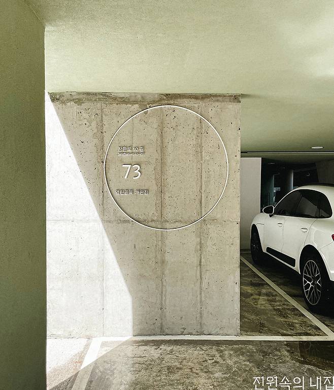 서울시 공지 기준에 따라 다세대 빌라는 옆 땅으로부터 1m를 이격해야 합니다. 옆 건물도 빌라면 건물 사이는 2m. 빌라 골목의 풍경을 지배하는 숫자입니다. 어차피 규모를 줄여야 하니 평면에 꼭 필요한 너비만큼 건물을 얇게 만들었습니다. 구조적인 정합성이나 주차의 효율, 피난 동선의 확보 등 자잘한 이점이 있으나 차치하고, 이로써 왼쪽 건물과 4.6m, 오른쪽 건물과 2.5m 떨어졌습니다. 오른쪽 건물이 새로 지어진다면 이쪽도 3.5m 이상 떨어지겠죠.