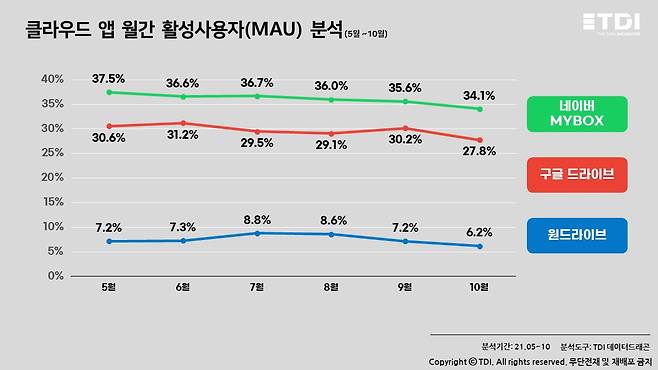 특히 최근 2년 동안은 코로나19 사태의 장기화로 인해 재택근무 비율이 높아지며 공간의 제약이 없고, 근로자들 간에 업무 내용을 간단하게 공유할 수 있는 클라우드 앱이 활발히 사용됐다. 올해 사람들은 클라우드 앱을 얼마나 많이 사용했을까? TDI(티디아이)에서는 국내에서 가장 많은 사용자수를 보유한 클라우드 앱 3개(Google 드라이브, Microsoft OneDrive, 네이버 MYBOX)를 분석해봤다.