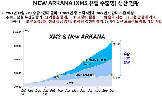르노삼성이 컨슈머인사이트의 판매서비스 만족도 부문에서 국내 완성차 제조사 가운데 1위를 차지한 점이나, 아르카나의 수출 5만대 달성 등은 르노삼성의 생산 공정이 높은 수준을 보인다는 것을 증명하고 르노그룹에서도 이를 인정하고 있다는 것을 의미한다. 아르카나는 2021년 총 누적 6만대, 2022년 10만대 수출을 예상하고 있다. 국내 시장 점유율이 부진한 현 상황 속에서 아르카나의 수출은 르노삼성 입장에서는 가동률 증대와 손익개선, 고용안정에 기여하고 있다.