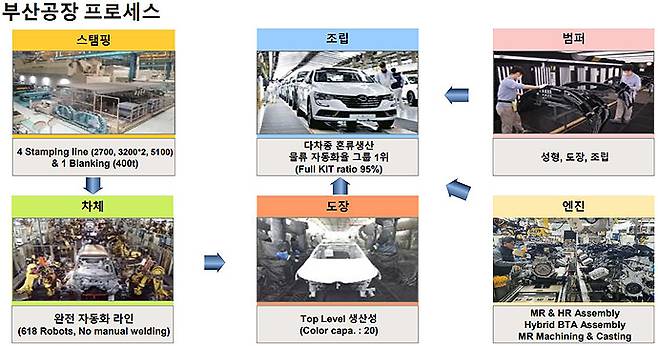 르노삼성 부산 공장에서는 현재 QM6와 SM6, XM3와 XM3의 수출형 모델인 아르카나, 그리고 동신모텍의 OEM으로 생산되는 트위지가 생산되고 있다. 차량 뿐만 아니라 엔진의 경우 2개의 가솔린 엔진과 1개의 하이브리드용 엔진, 그리고 하이브리드용 배터리가 생산되고 있다.