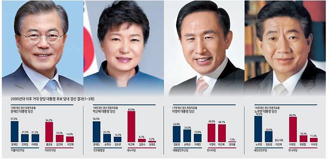 7일 헤럴드경제가 2000년대 들어 열린 지난 4차례 대선을 앞두고 열린 거대 양당(민주당 계열 정당·국민의힘 계열 정당) 경선을 분석한 결과, 당내 경선에서 조금이라도 더 높은 ‘최종 득표율’을 기록했던 후보가 본선에서도 승리를 거둔 것으로 나타났다.