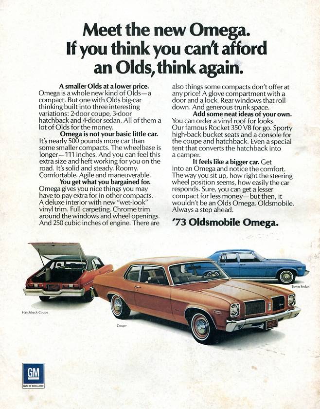 1973년 올즈모빌은 노바와 같은 X 플랫폼과 트림 라인으로 오메가를 제작했다. 대중의 인기로 검증이 됐기 때문이었다. 엔트리 모델로 2도어 세단, 3도어 해치백, 4도어 세단을 준비하여 선택의 즐거움을 배가시키려 노력했다.