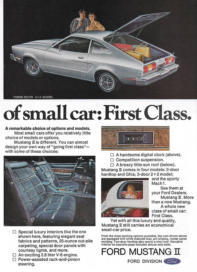 1970년 포드의 사장 자리에 앉은 리 아이아코카는 도요타 셀리카처럼 작은 몸집에 세련된 라인을 가진 머스탱을 주문했다. 높은 연비는 기본이었다. 미국에 수입된 일본 차 판매량이 안일했던 포드를 자극했던 셈이다.