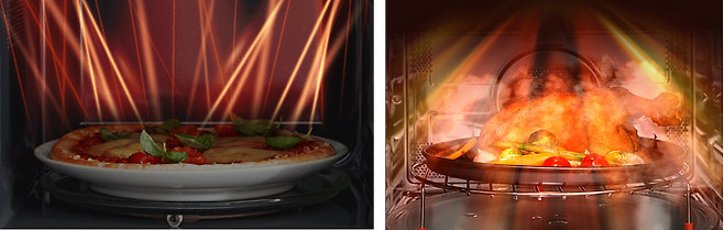 마이크로파를 만들어내는 전자레인지의 '마그네트론'은 오랜 시간 조리하는 오븐의 뜨거운 온도를 견디지 못하고 고장날 우려가 있기 때문에, 오븐에서는 마그네트론 대신 '빛'을 이용하는 '광파(원적외선)'으로 전자레인지를 대신합니다.