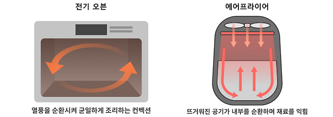 컨벡션 전기 오븐과 에어프라이어는 동일한 원리로 작동합니다. 컨벡션 전기 오븐이란 내부에 팬(fan)이 있어 공기 대류(convection)을 빠르게 일어나도록 도와주는 오븐인데요. 에어프라이어도 마찬가지로 내부의 팬이 열풍을 만들어 조리합니다.