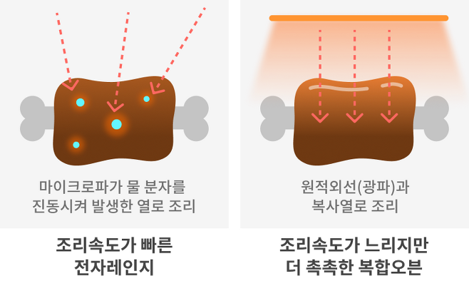 마이크로파를 만들어내는 전자레인지의 '마그네트론'은 오랜 시간 조리하는 오븐의 뜨거운 온도를 견디지 못하고 고장날 우려가 있기 때문에, 오븐에서는 마그네트론 대신 '빛'을 이용하는 '광파(원적외선)'으로 전자레인지를 대신합니다.
