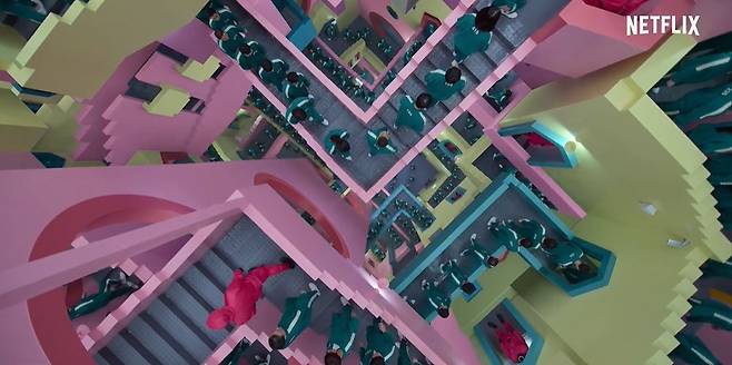넷플릭스 오리지널 시리즈 <오징어 게임>에서 나오는 계단은 강렬했다. 가장 인상적이고 기억에 남는 비주얼 요소 중 하나다.
