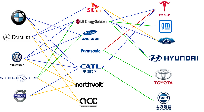 한중일 자동차 제조사들은 각 국가에 있는 배터리 제조사와 협력 관계를 이루고 있다. 예를 들어 현대자동차와 LG에너지솔루션, 토요타와 파나소닉, SAIC(상하이 모터)과 CATL이 협력관계를 구축하고 있다. 국가 정책, 기업 문화, 현지 기업을 보호하기 위한 분위기 등이 맞물려 나타난 현상으로 볼 수 있다.