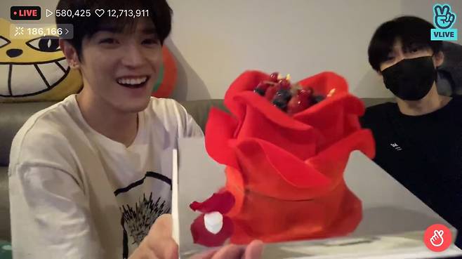 도영이 선물한 케이크를 맛보고 티아라도 써본 태용은 "받은 케이크 다 먹으면.."이라고 중얼거렸고 도영은 "다 못 먹는다"고 선을 그었다. 그만큼 받은 케이크가 많다는 것. 이어 태용은 어머니가 보내준 빨간 장미꽃 형태의 아름다운 케이크를 공개했다.