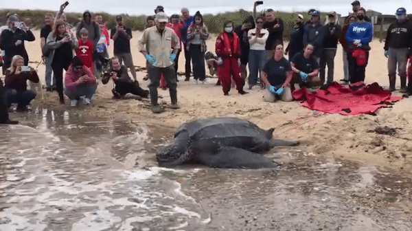 이들 단체의 도움으로 보호된 장수거북은 12일 코드곶 북쪽 끝 레이스곶에 있는 항구도시 프로빈스타운의 헤링코브 해변으로 옮겨졌고, 뉴잉글랜드 아쿠아리움 직원들에게 검사를 받았다. 전문가는 장수거북이 아직 건강하다고 판단했고 그후 관계자들과 주민을 비롯한 많은 사람이 지켜보는 가운데 이틀만에 바다로 돌아갈 수 있었다.