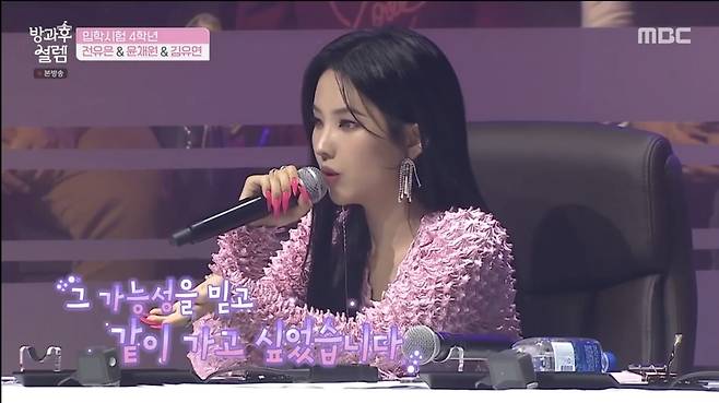 김유연의 '가시나' 무대를 감한 전소연은 "유연 학생은 '방과후 설렘'을 검색했을 때 가장 먼저 이름이 뜨더라. 그런 걸 보면 연예인으로서 눈이 가는 사람인 것 같아서, 사람을 끌어당기는 매력은 그 팀에 도움 될 수 있으니까 가능성이 있다고 생각하고 포기하지 않았으면 좋겠다"고 말했다.