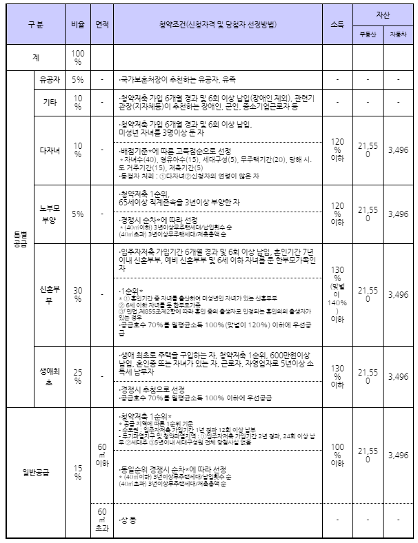 특별분양의 경우 공급유형에 따라 입주자저축ㆍ자산요건ㆍ소득요건ㆍ무주택세대주 등의 자격을 갖춰야하며, 구체적인 자격은 공고문을 통해 확인할 수 있습니다.