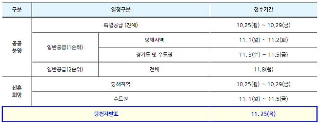 ‘공공분양주택’의 경우 10.25(월)~10.29(금)까지 닷새간 특별공급에 대한 청약신청 접수가 진행되며, 11.1(월)~11.2(화)에는 일반공급 1순위 중 당해지역 거주자, 11.3(수)~11.5(금)에는 경기도ㆍ수도권 거주자 접수가 진행되며, 일반공급 2순위 대상자는 11.8(월)에 일괄로 청약신청 접수가 진행됩니다.