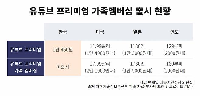 유튜브가 한국 소비자를 ‘홀대’ 한다는 지적이 나오는 이유다. 지난해 10월 변재일 더불어민주당 의원은 국정감사를 통해 유튜브 프리미엄 가족 멤버십 부재를 지적하며 “차별적인 요금정책의 개선이 필요하다”고 지적하기도 했다. 유튜브측은 “사용자들의 시청 경험 향상을 위해 다양한 서비스를 더 많은 국가에 제공하고자 노력하고 있다”고 밝혔다.