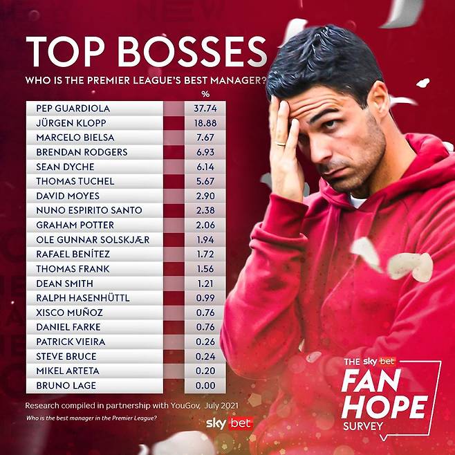 영국 베팅업체 '스카이벳'은 12일(한국시간) 프리미어리그 감독 중 누가 최고인지 팬들을 대상으로 실시한 설문조사 결과를 공개했다.