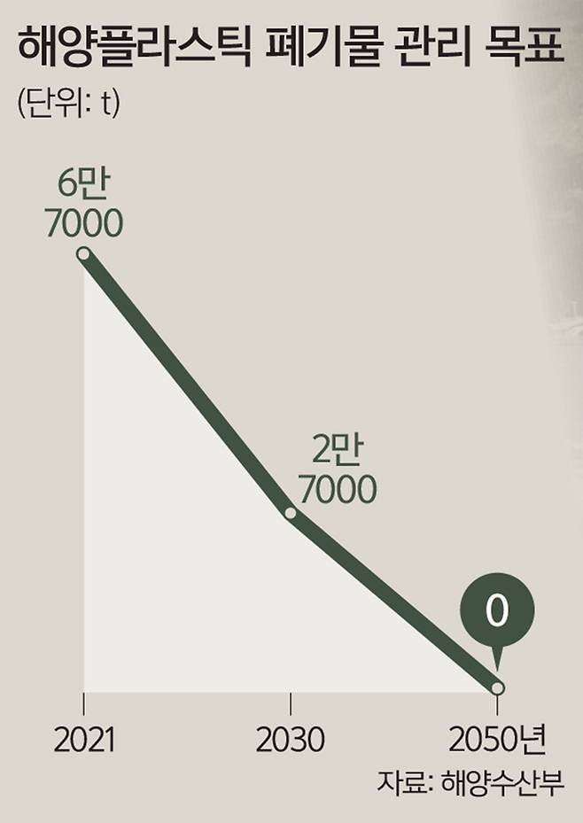 정부는 올해 해양 플라스틱 쓰레기 발생량을 6만7000t으로 예상했다. 이를 2030년까지 60% 감축한 2만7000t으로 줄이고 2050년엔 ‘제로화’하는 것이 목표다.