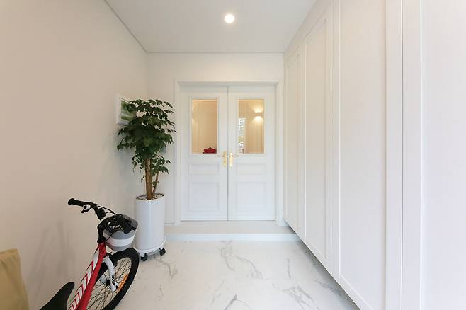 화이트로 밝게 꾸민 공간에 비앙코 포셀린 타일과 골드 손잡이를 사용해 포인트를 주었다. 중문과 가구 도어에는 몰딩을 적용해 고급스러움을 더했다.