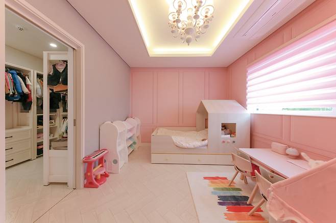 핑크 톤 웨인스코팅 뮤럴벽지와 크림 톤 가구를 배치해 예쁜 공주님 방으로 완성했다.