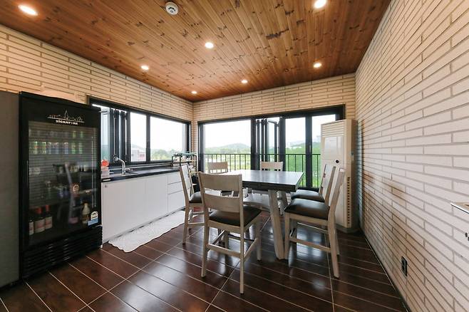 간이주방을 설치하고 바닥을 타일로 마감해 언제나 식사와 가족모임이 가능한 공간으로 연출했다. 게다가 폴딩도어를 설치해 야외에서 식사하는 기분을 내도록 하면서, 공간 활용성까지 높였다.