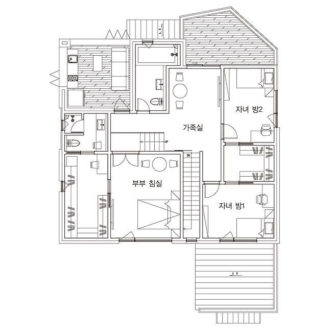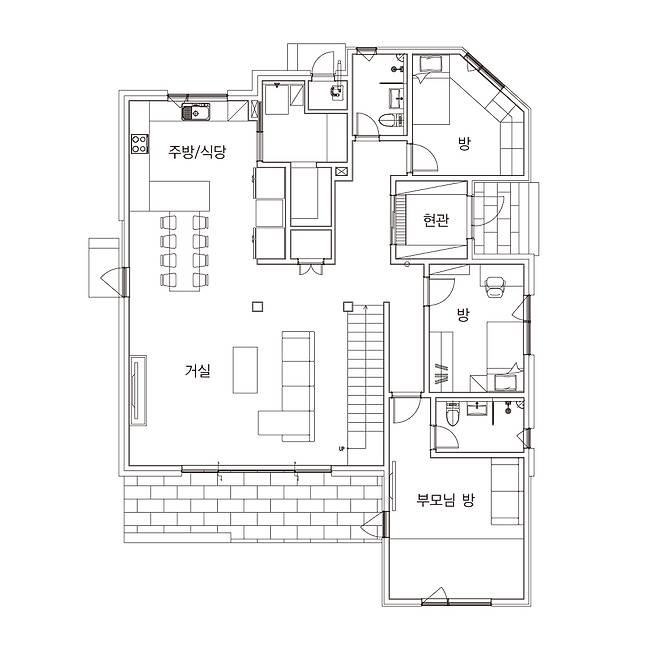 이 주택에는 건축주 부부와 부모님, 자녀들이 함께 생활한다. 거주 인원이 7명이라 방이 많이 필요했고, 거실과 주방도 넓어야했기에 설계에서 가장 중점 둔 사항은 최대한 공간 낭비를 줄이는 것이었다. 전체 면적 대비 많은 방이 필요했지만, 거실과 주방 크기를 줄이는 건 원하지 않았다. 따라서 거실과 주방 면적에 20평 정도 할애하고 일체형으로 계획해 가족이 다 모여도 넉넉한 공간으로 계획했다. 부부가 거주하는 2층에도 탁 트인 가족실과 테라스를 만들어 답답하지 않게 했다.