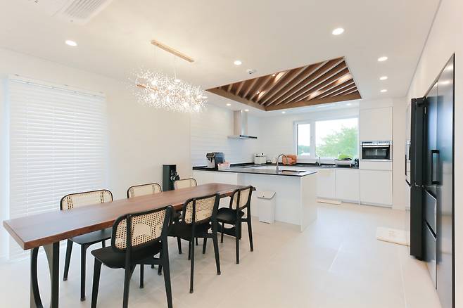 벽면 타일을 음각 형태로 제작해 웨인스코팅 분위기와 연결한 듯한 느낌을 내 전체 인테리어 통일감을 주고, 천장 루버를 짙은 우드 컬러에 사선 형태로 디자인해 포인트를 살렸다. 여기에 내추럴한 주방 가구를 매치해 고급스러운 분위기를 냈다.