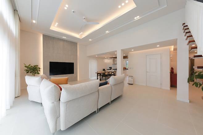 웜 톤 연그레이 타일을 바닥과 아트월에 매치해 단정하고 미니멀한 분위기를 만들었다. 천장과 아트월에 은은한 간접조명을 설치하고 샤무드 소파를 배치해 더욱 포근하고 아늑한 공간으로 연출했다.