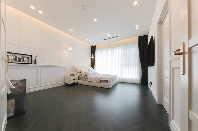 부부 침실은 헤드월에 액자 형태 몰딩으로 포인트를 주고 벽면에 부드러운 웨인스코팅과 블랙 헤링본 강마루가 어우러지도록 마감해 고급스러운 프렌치 스타일로 연출했다.