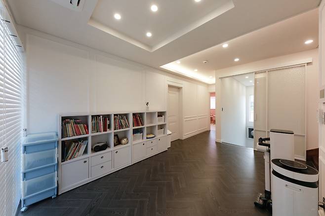 가족실은 벽면에 웨인스코팅으로 마감하고 블랙 톤 헤링본 마루를 조합해 품위가 넘치면서 아늑한 프렌치 스타일로 연출했다.