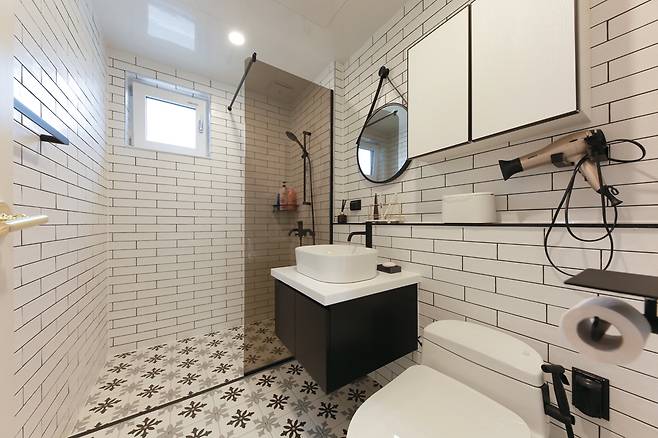 블랙 액세서리와 포인트 타일로 마감해 모던하고 세련된 공간으로 연출했다. 세면대 하부장과 탑볼이 공간에 세련미를 더한다.